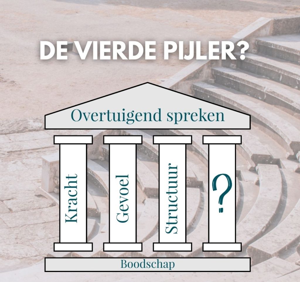 Sprekers die echt impact maken, bouwen op vier pijlers. De meesten kennen er twee. Een enkeling drie. De vierde? Die pijler heb ik zelf ontwikkeld. Maar hij is geworteld in iets wat verloren ging toen de Grieken retorica een vak maakten. Ze perfectioneerden de techniek, maar sneden daarmee ook iets weg wat mensen raakt.